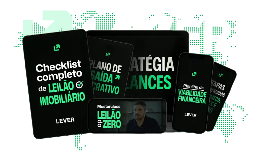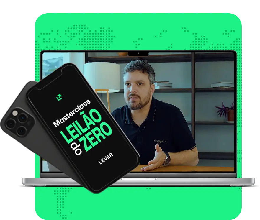 Hoje, ele é professor de leilão de imóveis na Escola Lever, condensando anos de prática pra ensinar quem quer começar com clareza, segurança e foco no lucro.